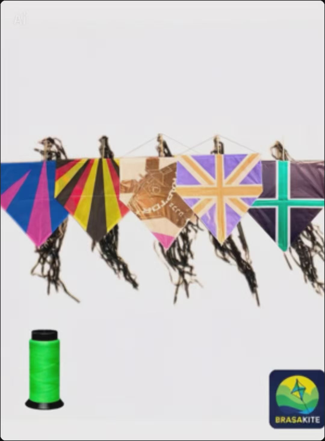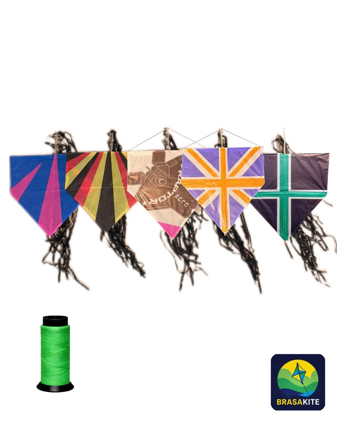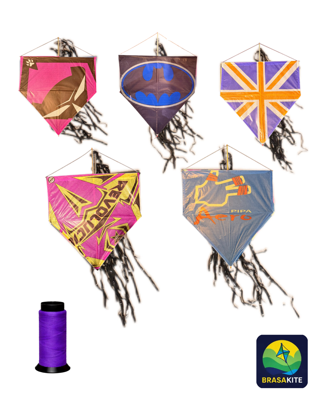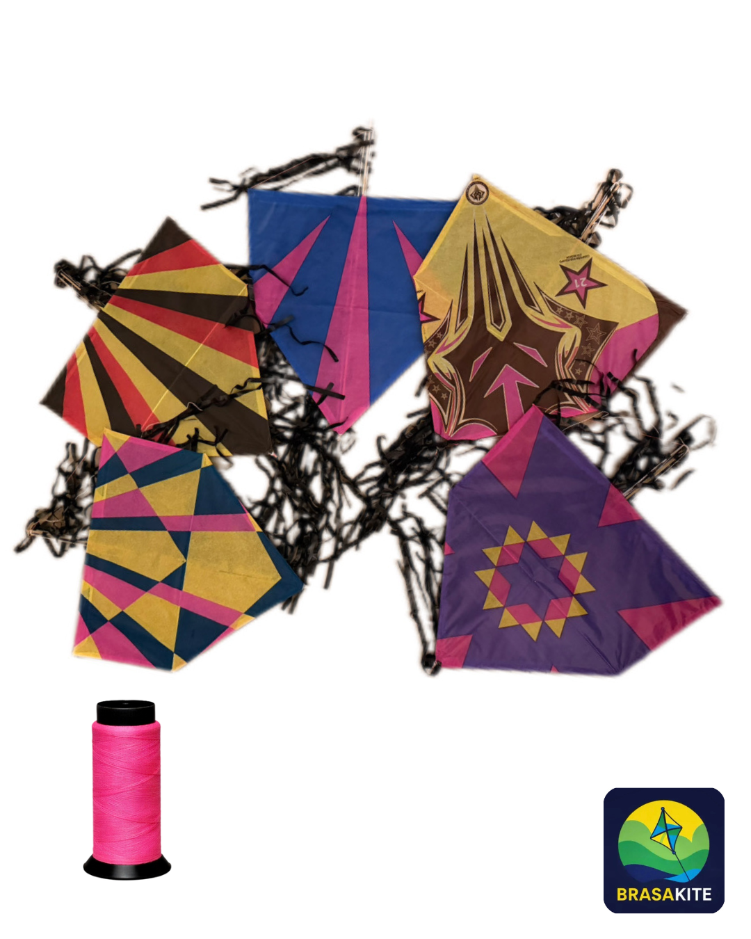 O Kit com 5 Pipas da BrasaKite é perfeito para quem quer soltar pipa em grupo, com amigos ou em família. O conjunto inclui 5 pipas de 50 cm, cada uma acompanhada de rabiola de 5 metros, além de 1 linha resistente de 100 jardas (91,4 metros), pronta para uso.